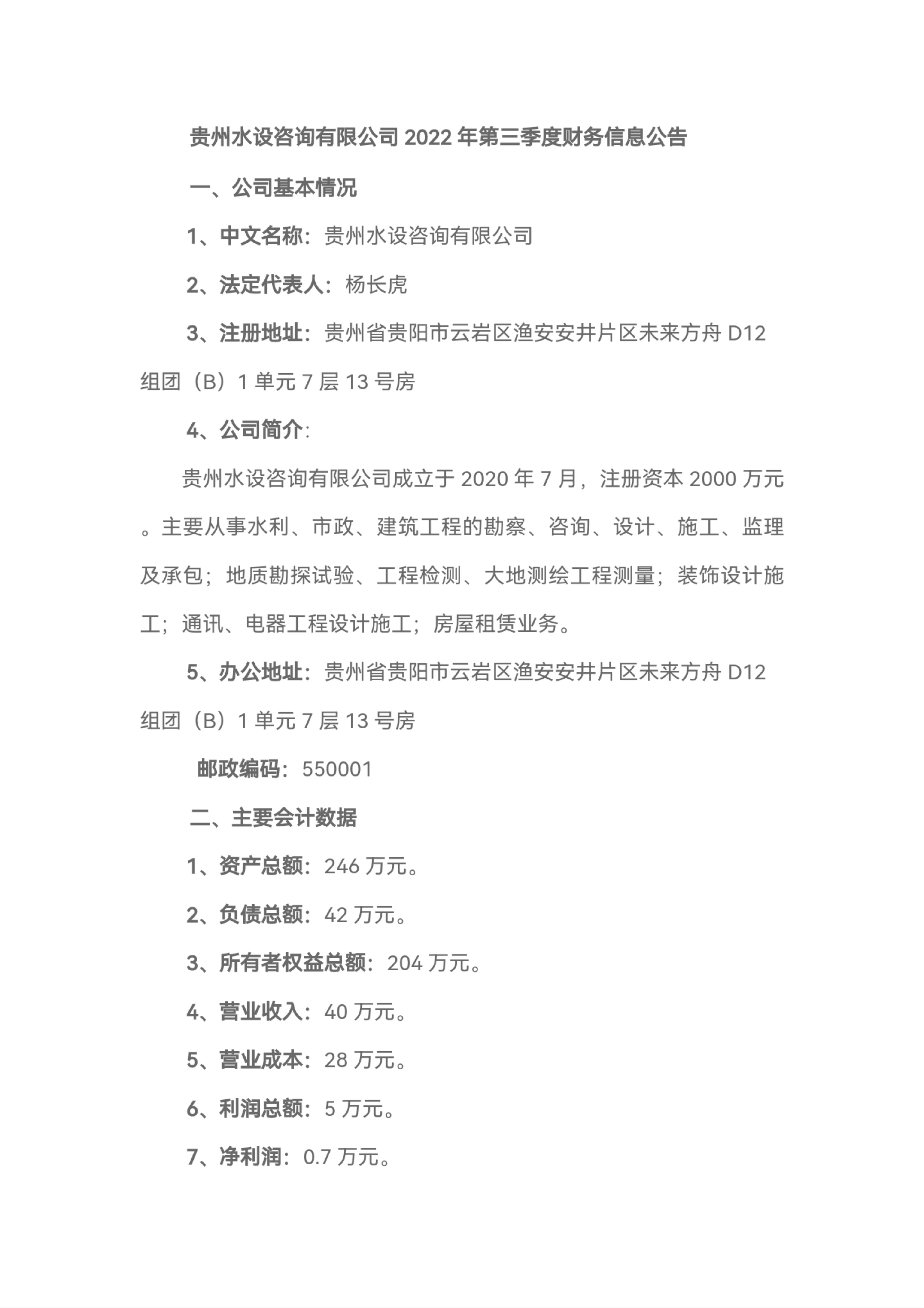 貴州水設咨詢有限公司2022年第三季度財務信息公告