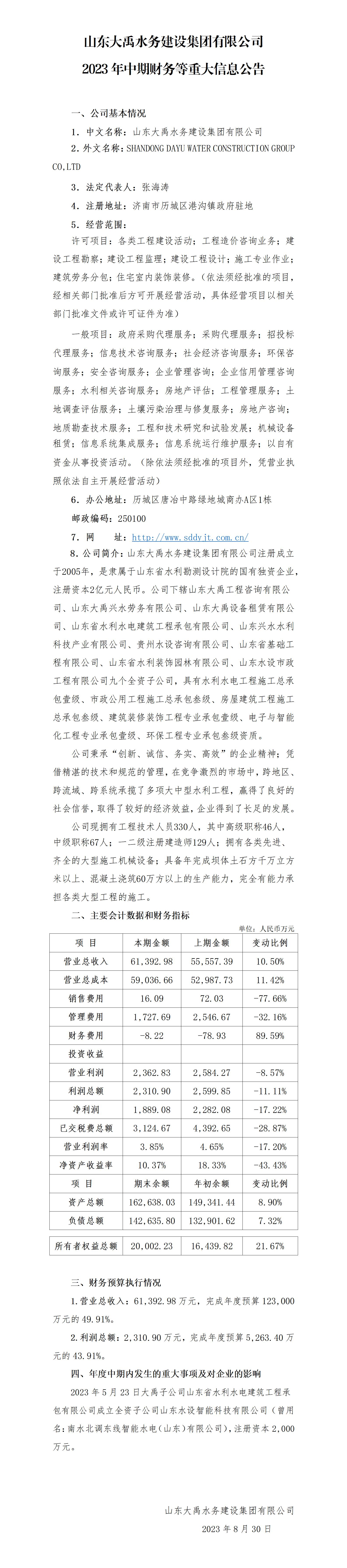 山東大禹水務建設集團有限公司2023年中期財務等重大信息公告