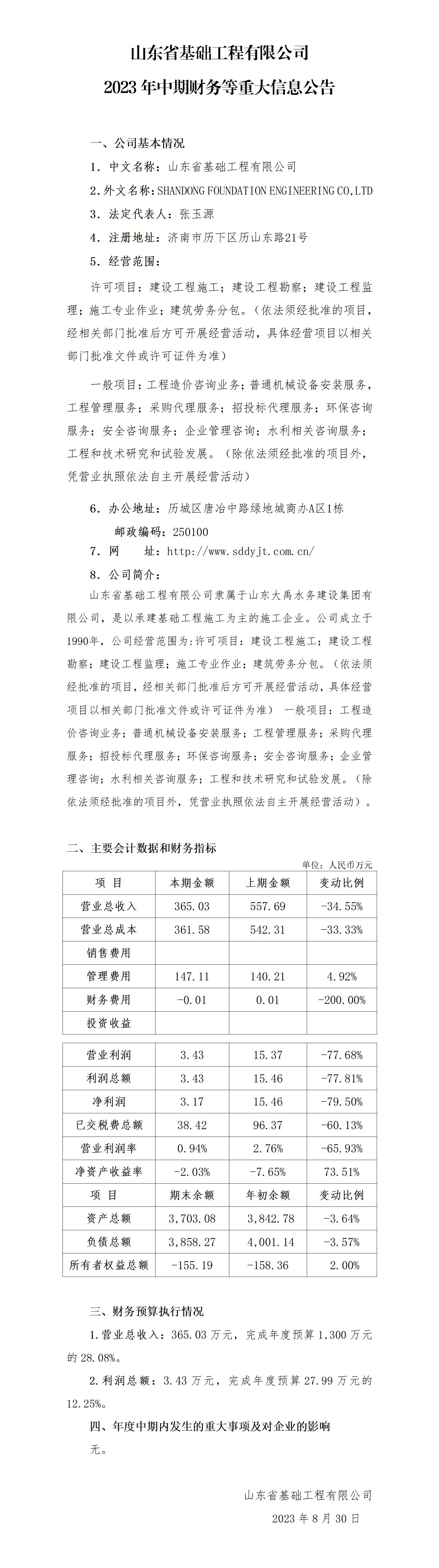 山東省基礎(chǔ)工程有限公司2023年中期財(cái)務(wù)等重大信息公告