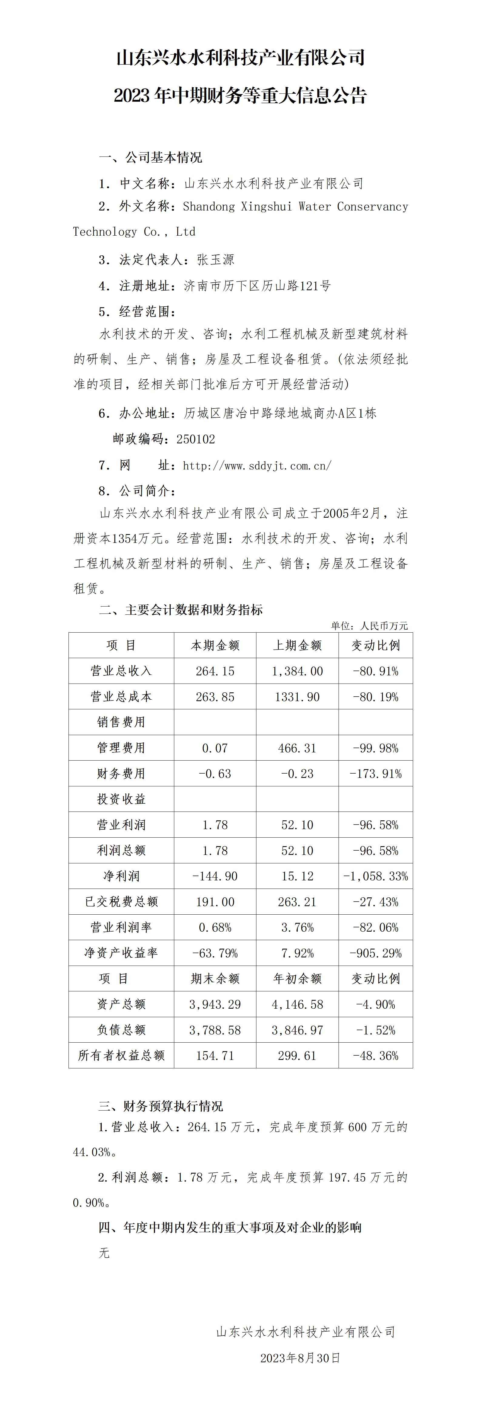山東興水水利科技產(chǎn)業(yè)有限公司2023年中期財務等重大信息公告