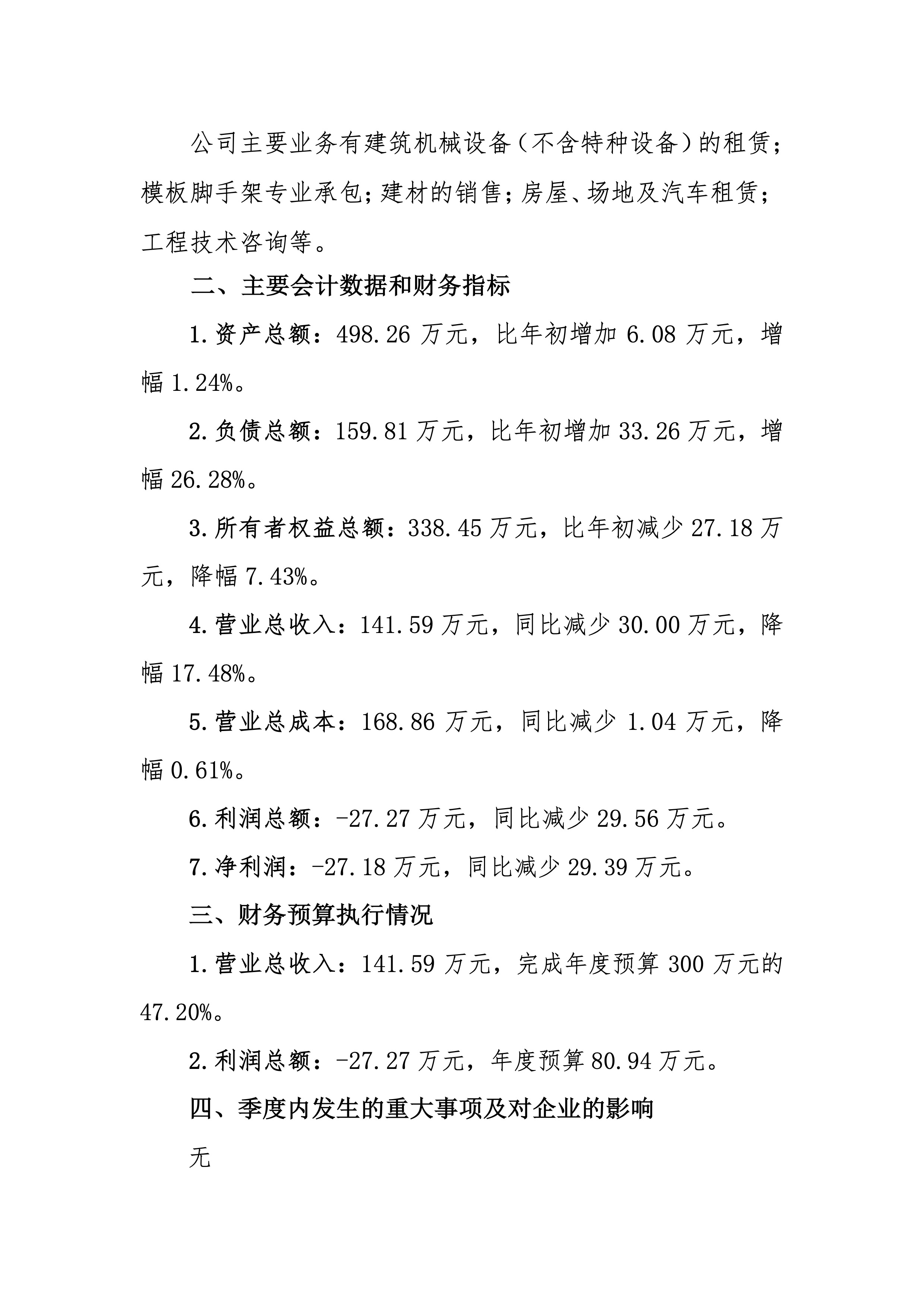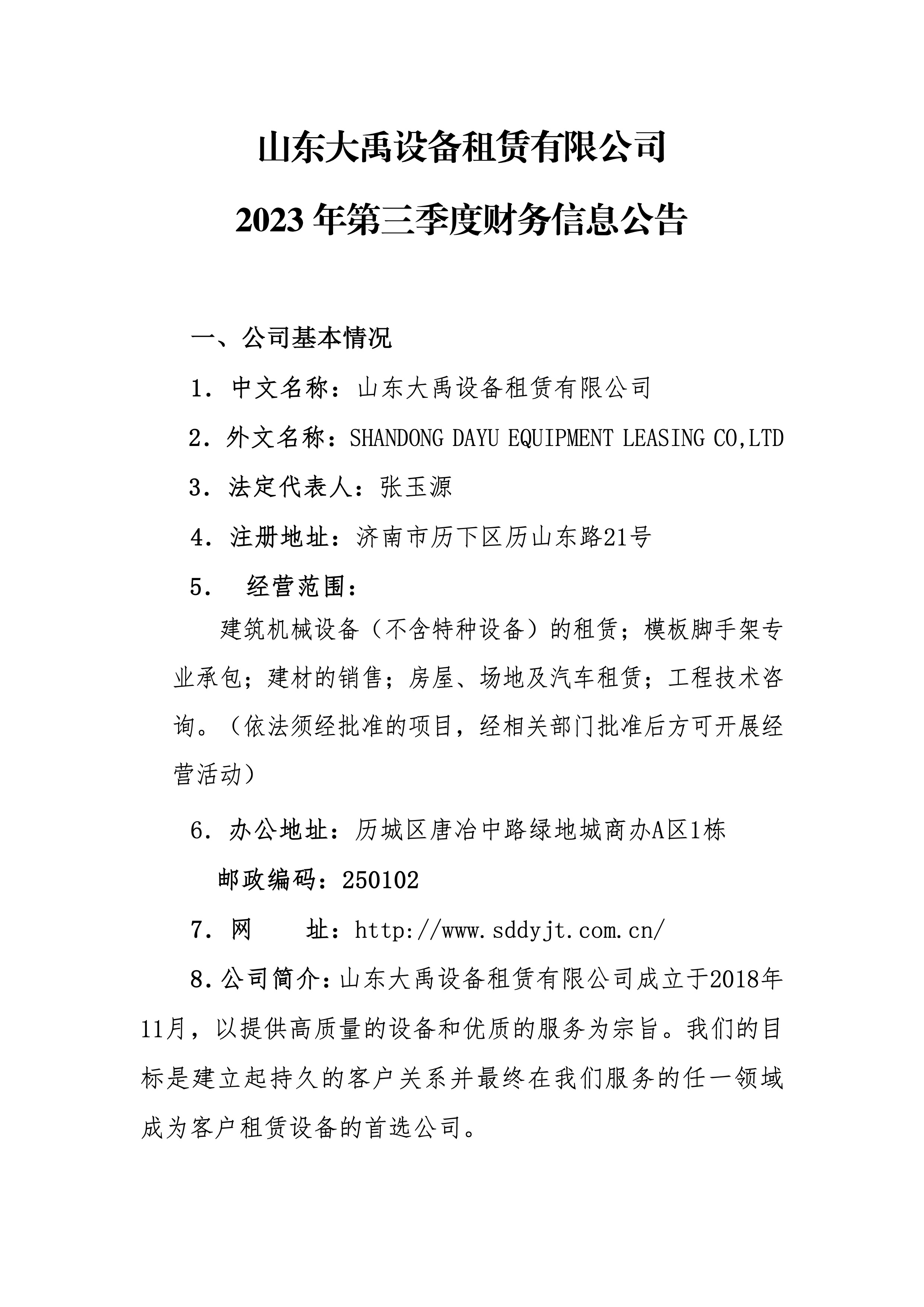 山東大禹設備租賃有限公司2023年第三季度財務信息公告