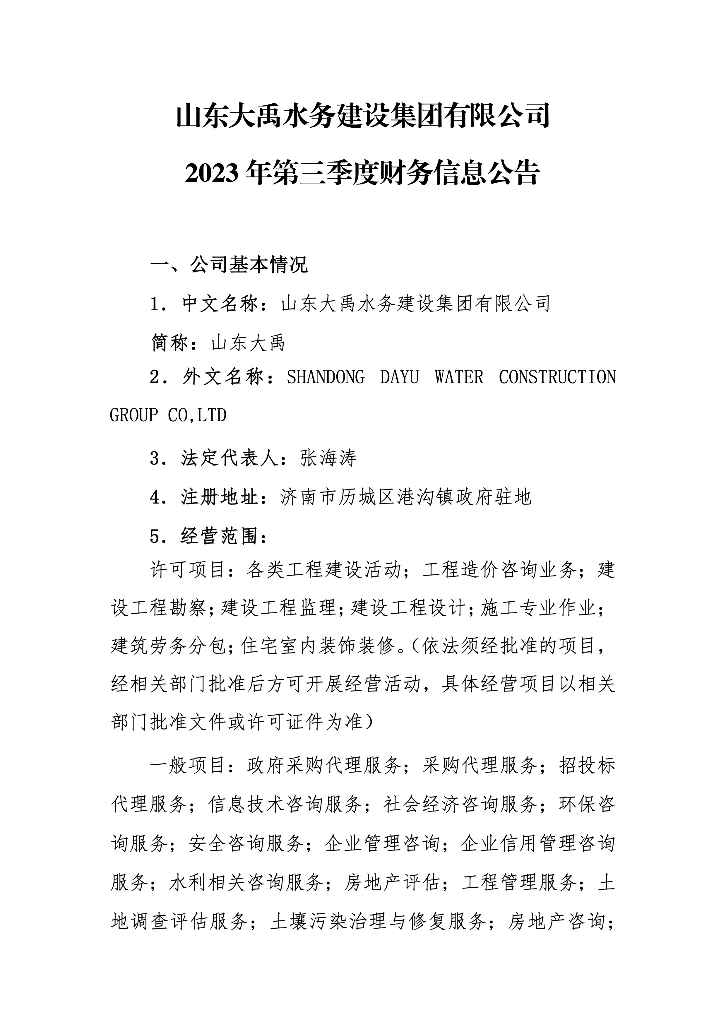 山東大禹水務建設集團有限公司2023年第三季度財務信息公告