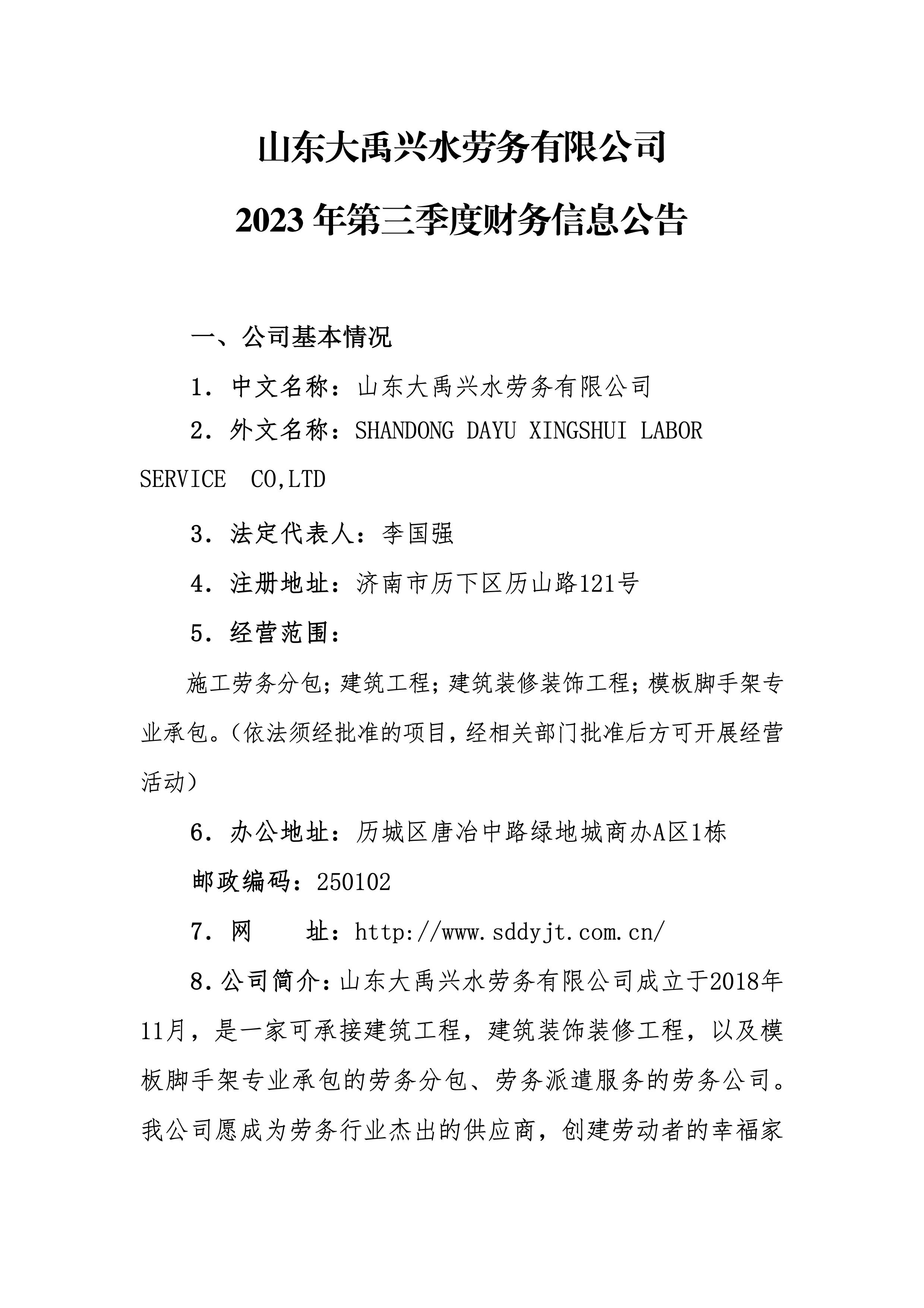 山東大禹興水勞務有限公司2023年第三季度財務信息公告