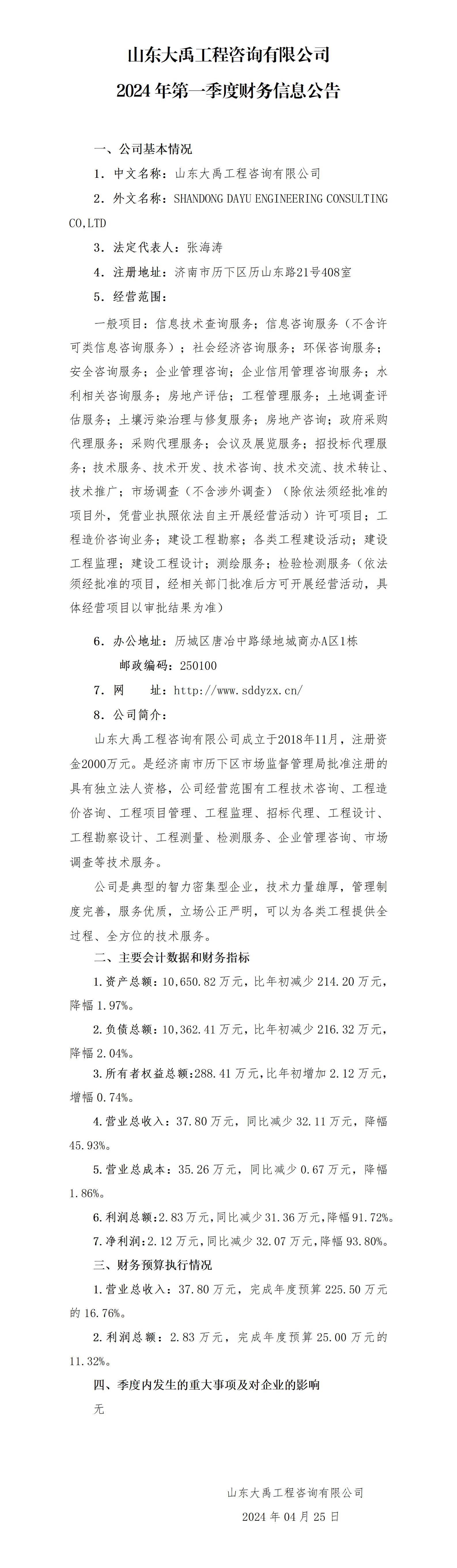 山東大禹工程咨詢有限公司2024年第一季度財務信息公告