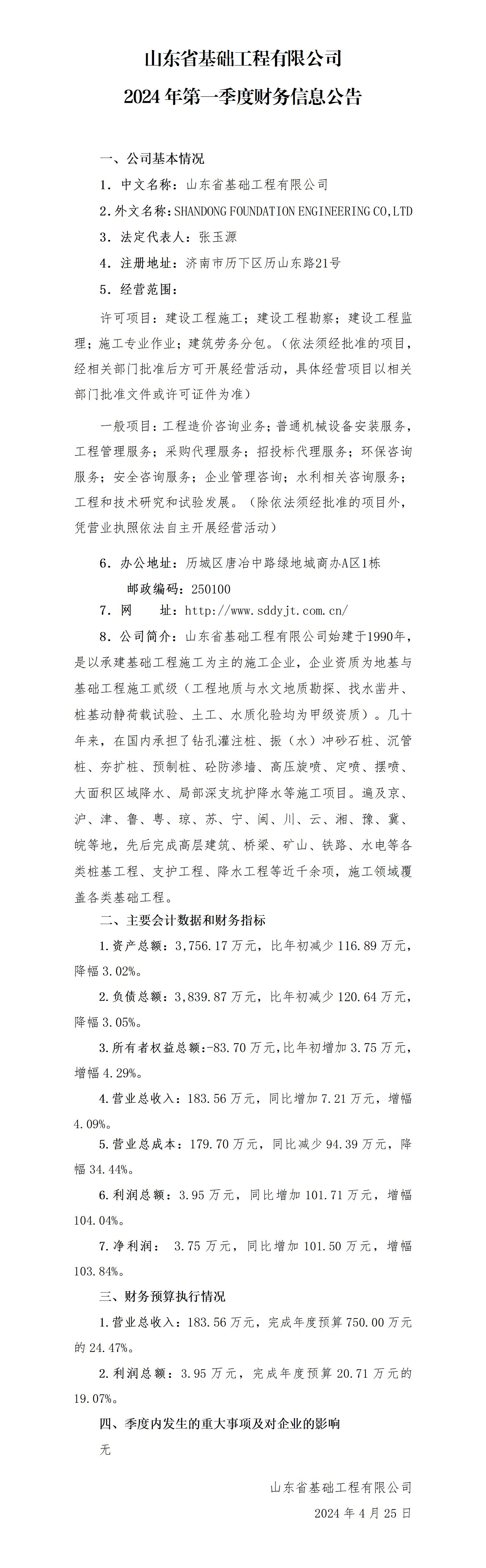 山東省基礎工程有限公司2024年第一季度財務信息公告