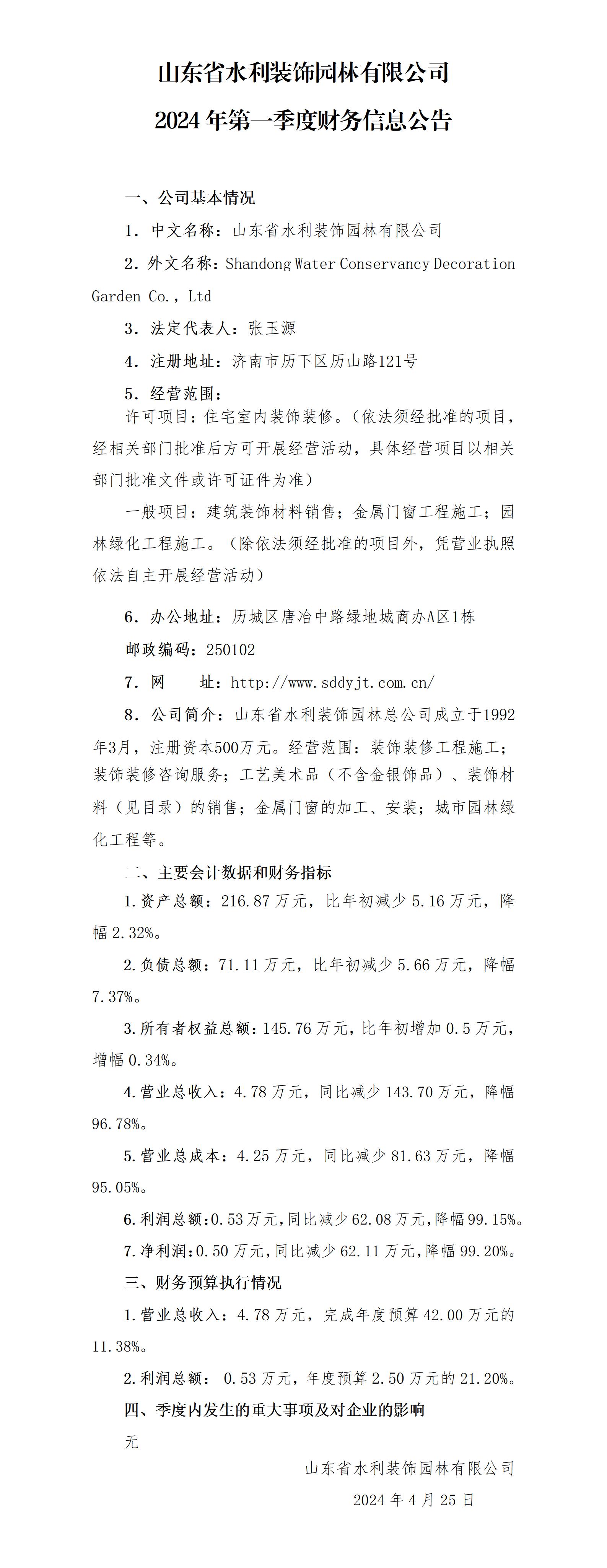 山東省水利裝飾園林有限公司2024年第一季度財務信息公告