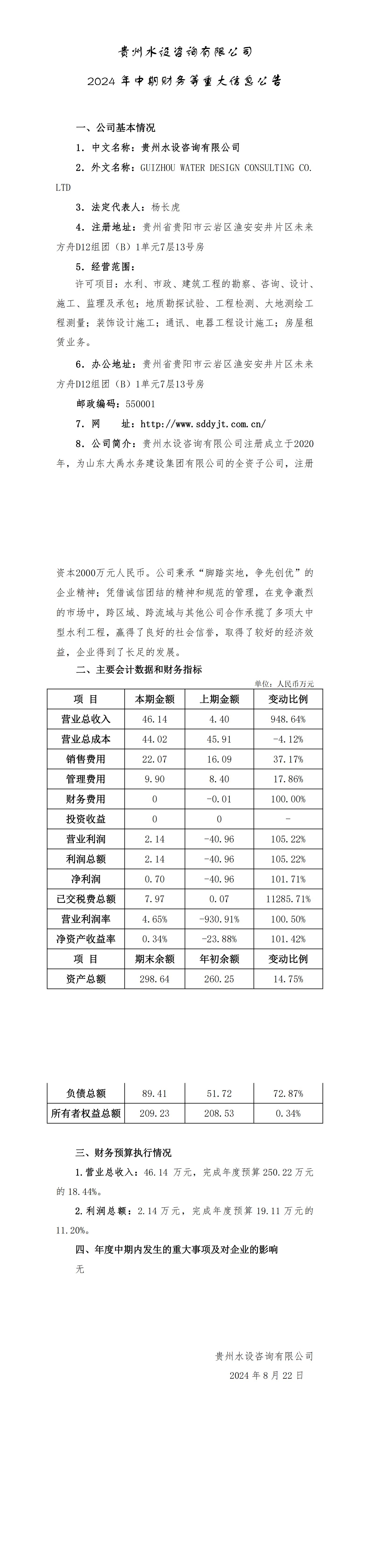 貴州水設咨詢有限公司2024年中期財務等重大信息公告