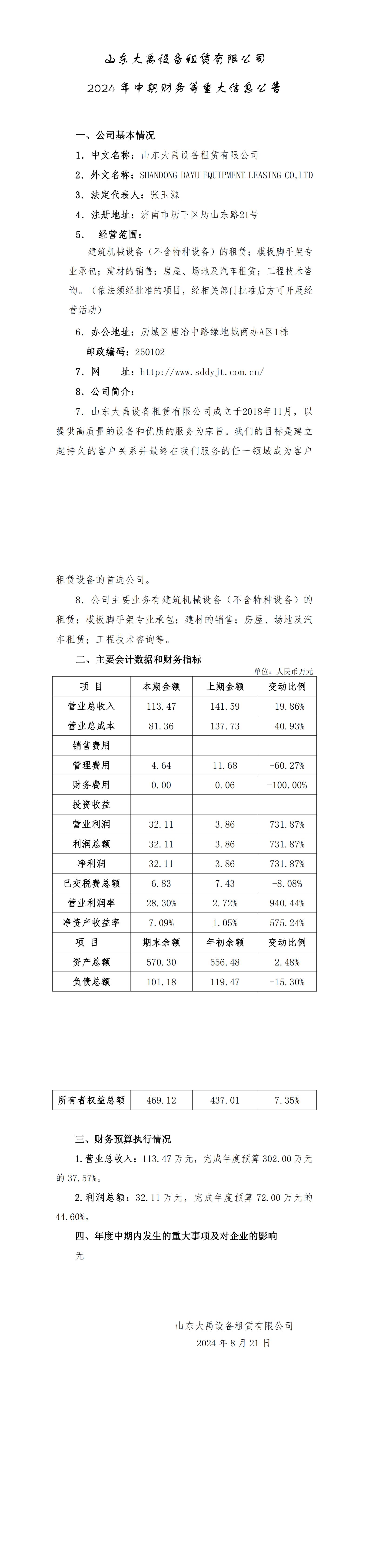 山東大禹設備租賃有限公司2024年中期財務等重大信息公告