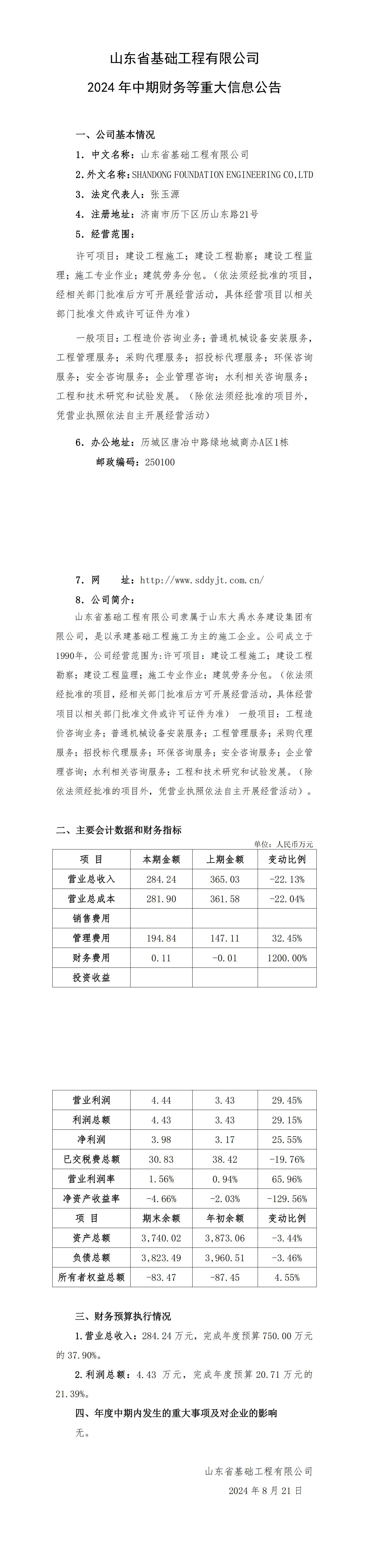 山東省基礎工程有限公司2024年中期財務等重大信息公告