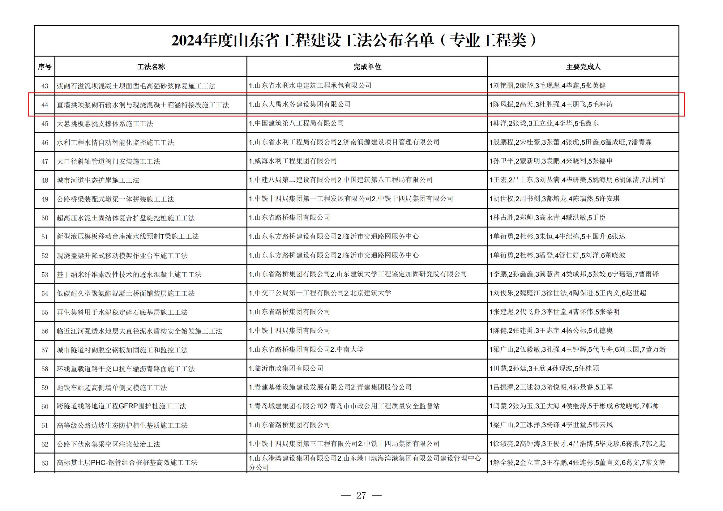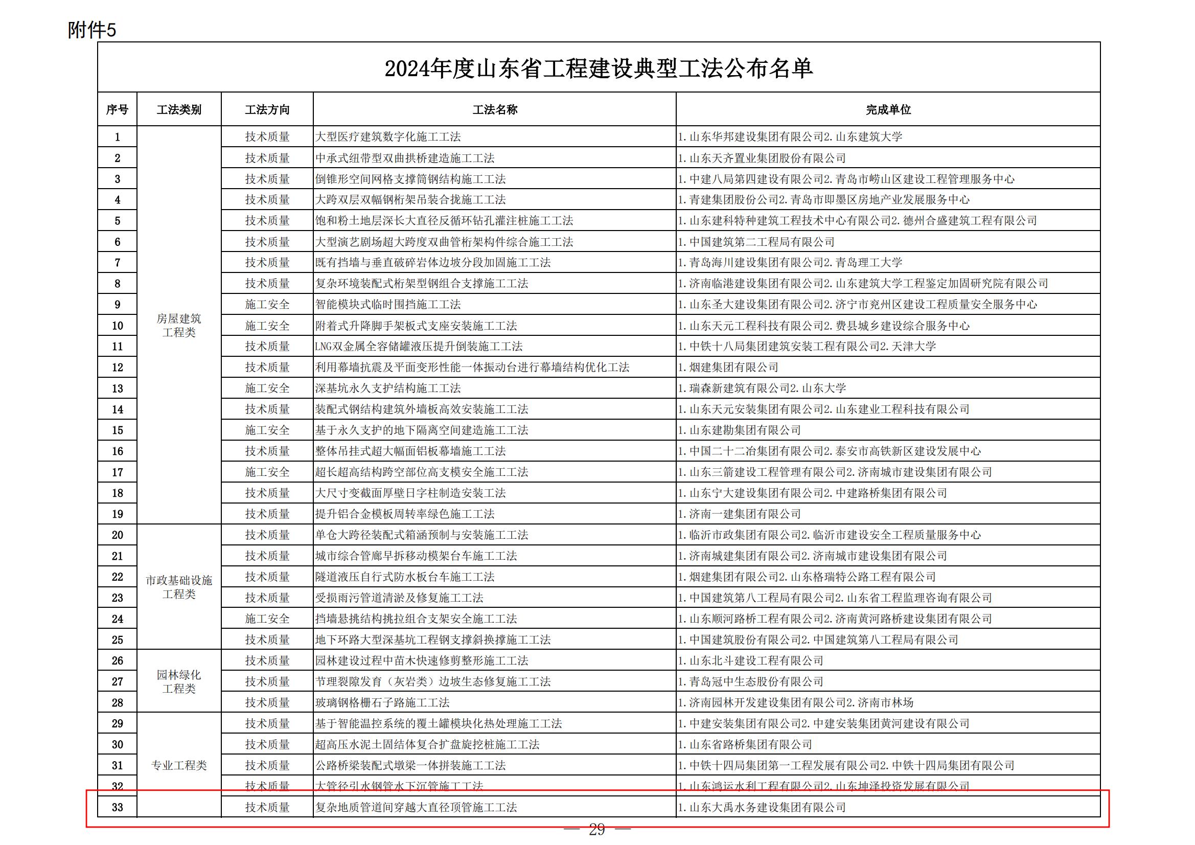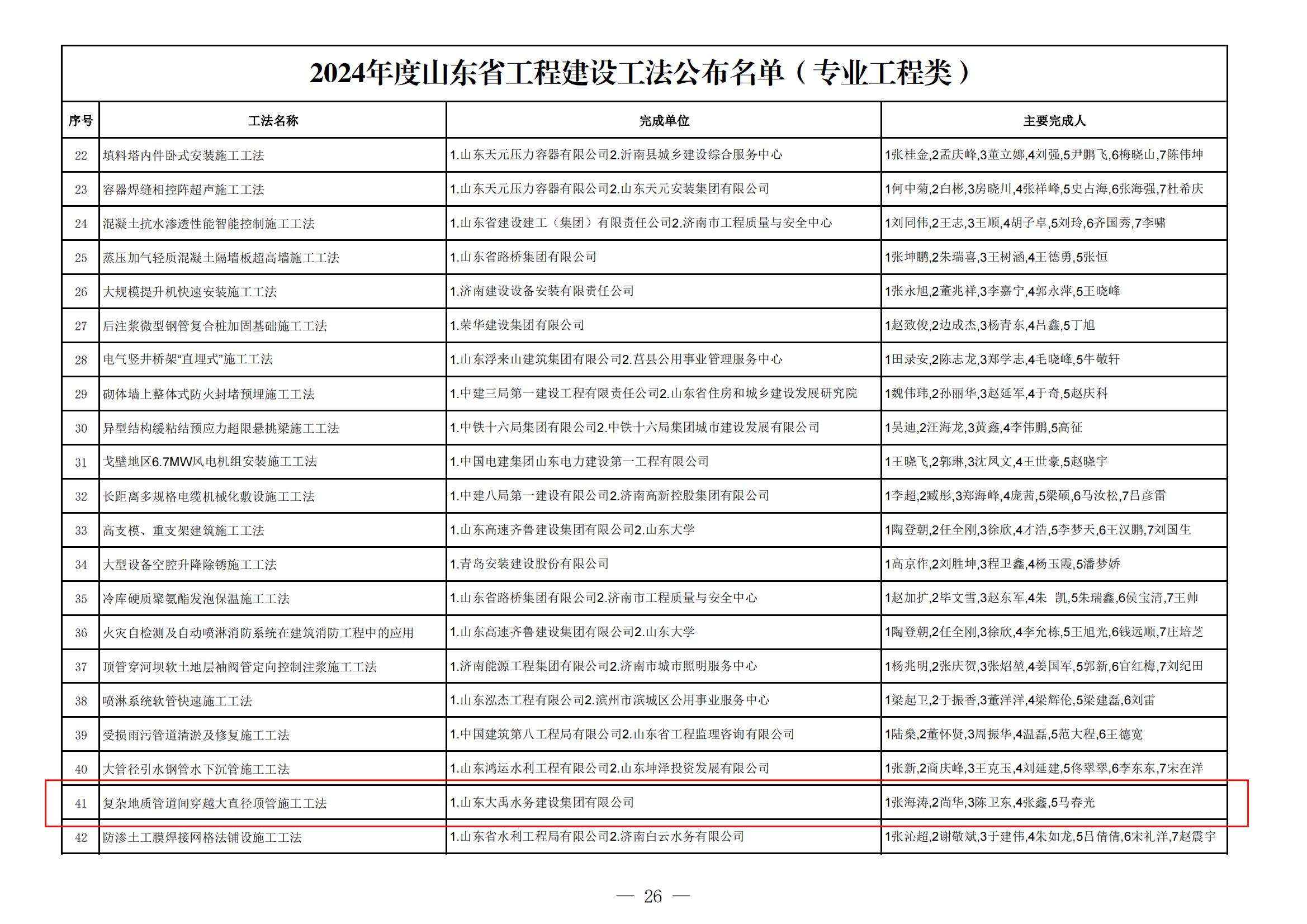 近日,山東省住房和城鄉建設廳正式公布2024年度山東省工程建設工法的評選結果。經過一系列嚴格而細致的評審,集團公司申報的《復雜地質管道間穿越大直徑頂管施工工法》《直墻拱頂漿砌石輸水洞與現澆混凝土箱涵銜接段施工工法》兩項工法脫穎而出,榮獲“2024年度山東省工程建設工法”榮譽稱號。其中,《復雜地質管道間穿越大直徑頂管施工工法》被評為典型工法。