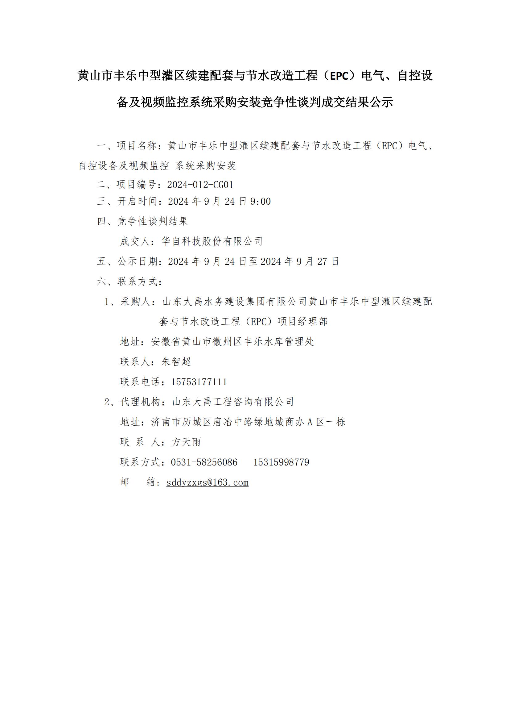 黃山市豐樂中型灌區續建配套與節水改造工程(EPC)電氣、自控設備及視頻監控系統采購安裝競爭性談判成交結果公示