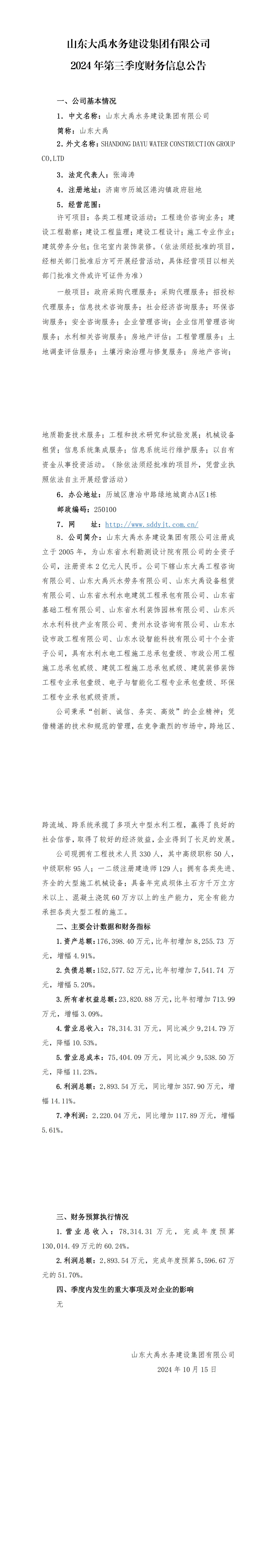 山東大禹水務建設集團有限公司2024年第三季度財務信息公告