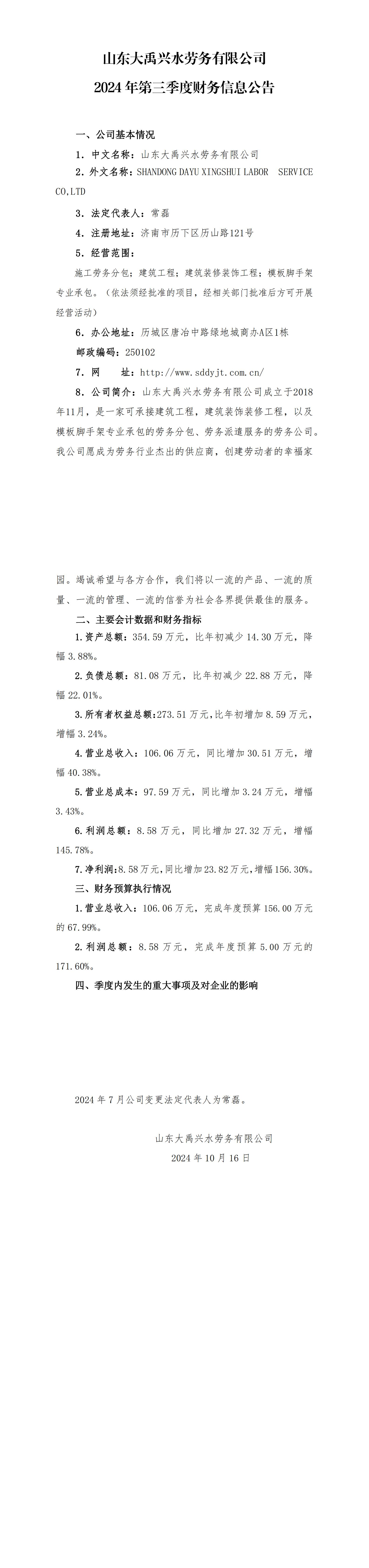 山東大禹興水勞務有限公司2024年第三季度財務信息公告