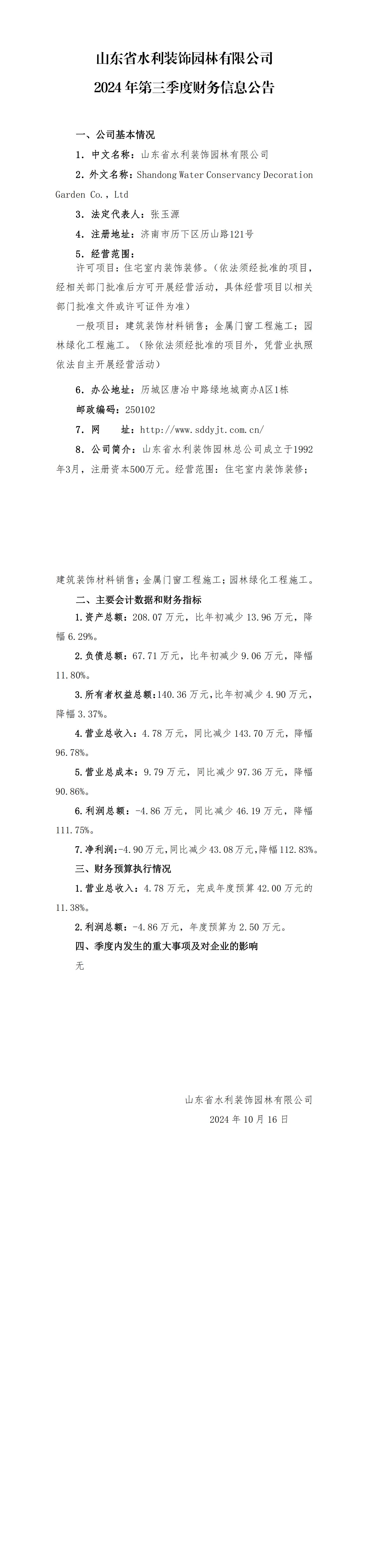 山東省水利裝飾園林有限公司2024年第三季度財務信息公告