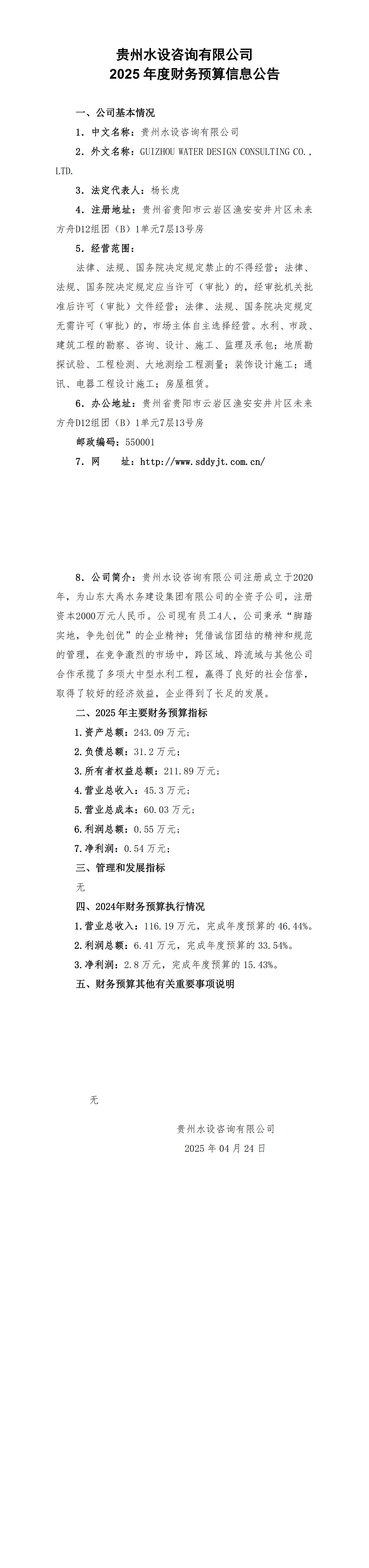 貴州水設咨詢有限公司2025年度財務預算信息公告
