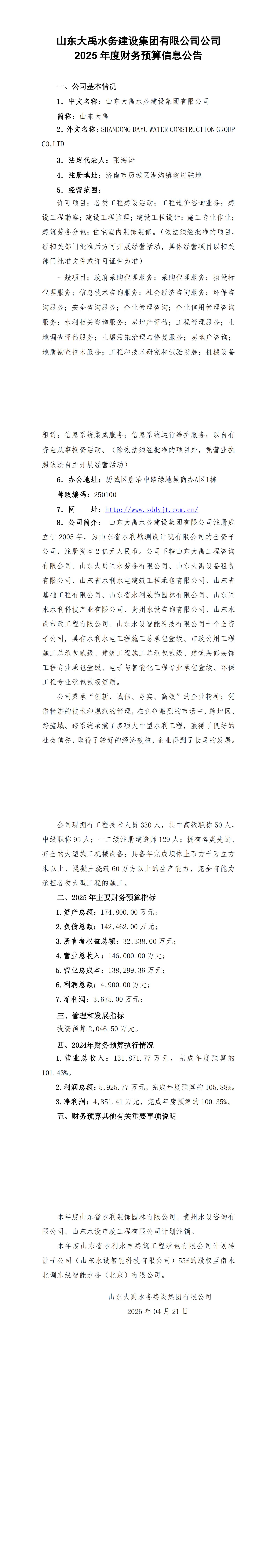 山東大禹興水勞務有限公司2025年財務預算信息公告