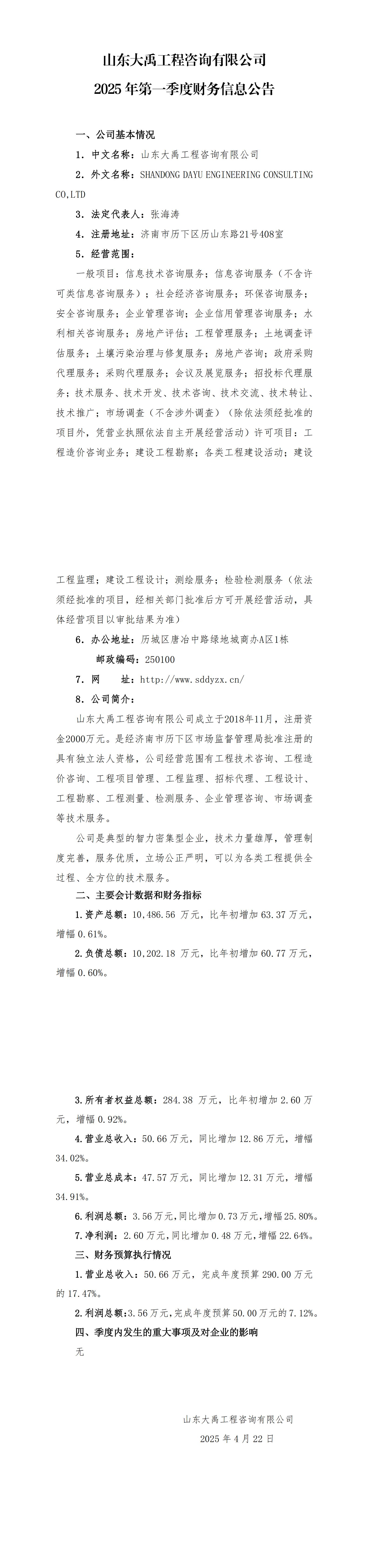 山東大禹工程咨詢有限公司2025年第一季度財(cái)務(wù)信息公告