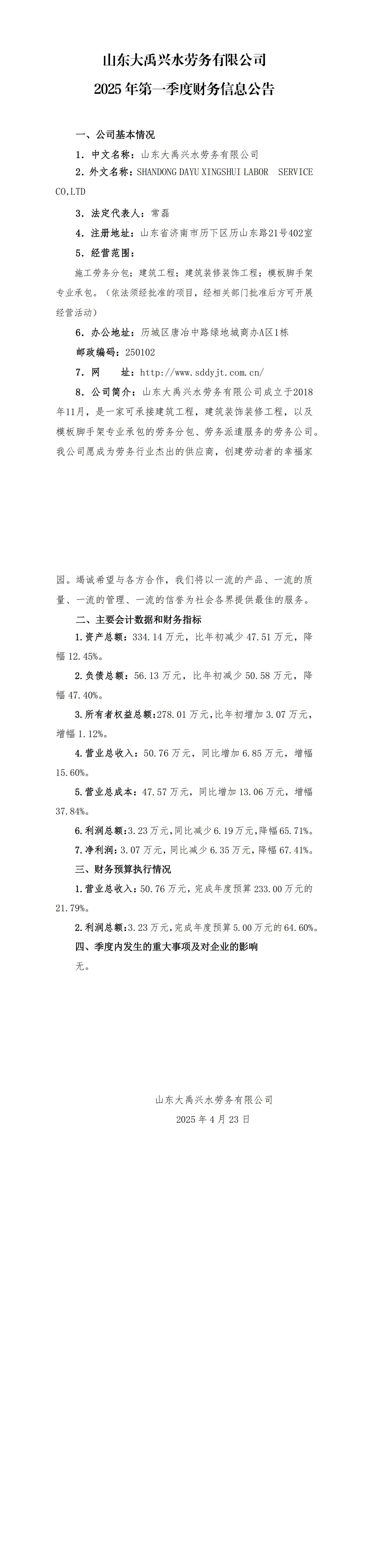 山東大禹興水勞務有限公司2025年第一季度財務信息公告
