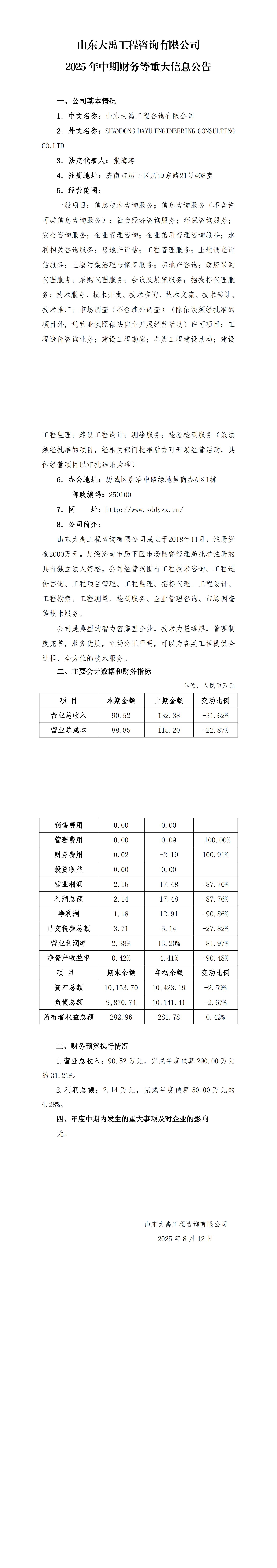 山東大禹工程咨詢有限公司2025年中期財務等重大信息公告