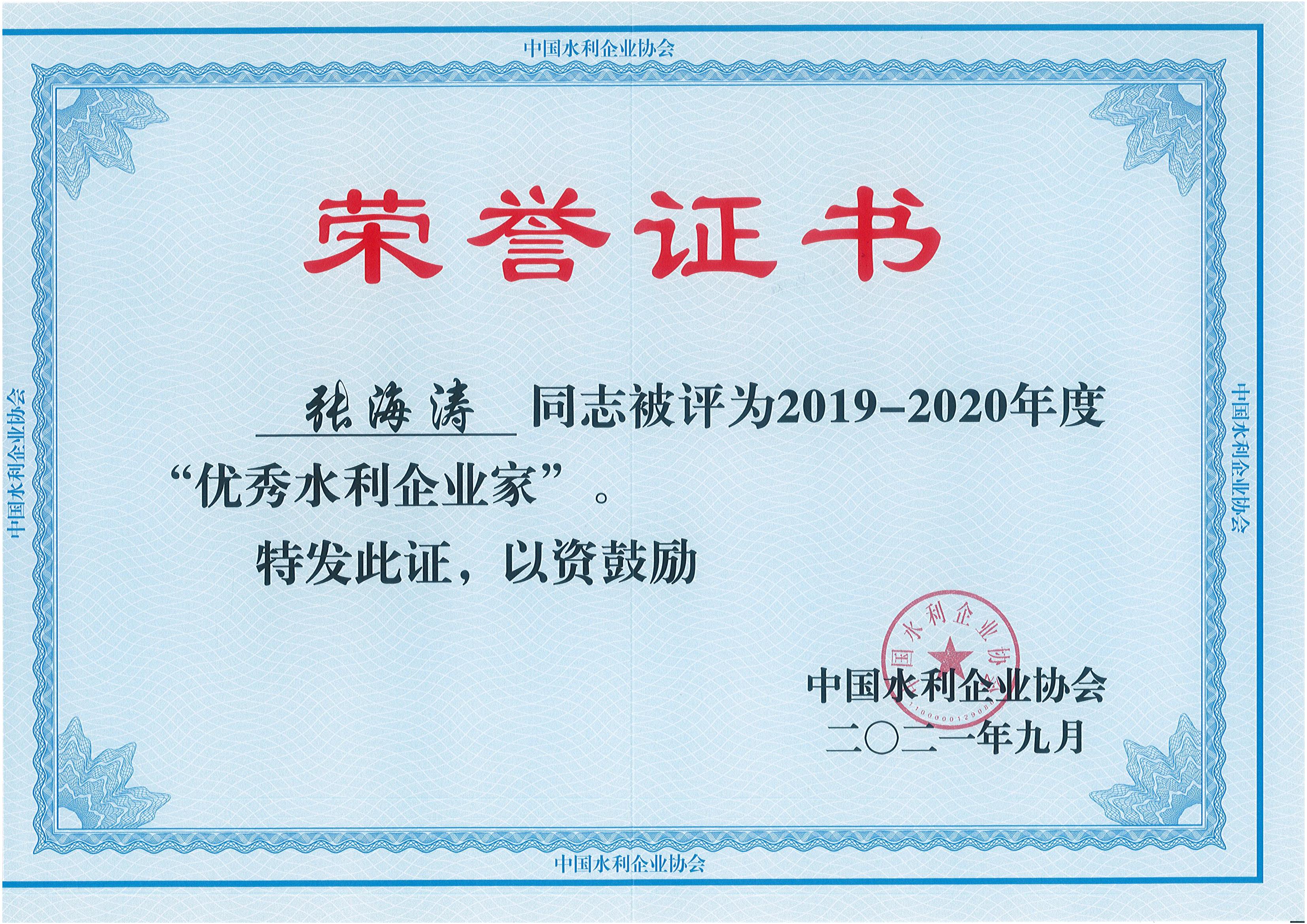 優(yōu)秀水利企業(yè)家證書